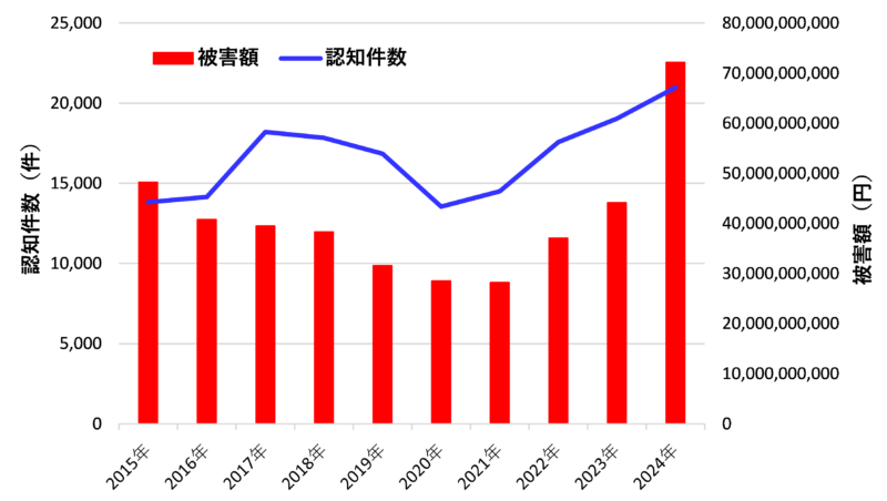 実際の被害については、警察庁が発表したデータによると、特殊詐欺やSNSを利用した投資詐欺、ロマンス詐欺の認知件数と検挙状況は、時折の変動はあるものの、全体として増加傾向にあり、2024年には、被害件数と被害額が過去最大となっています。