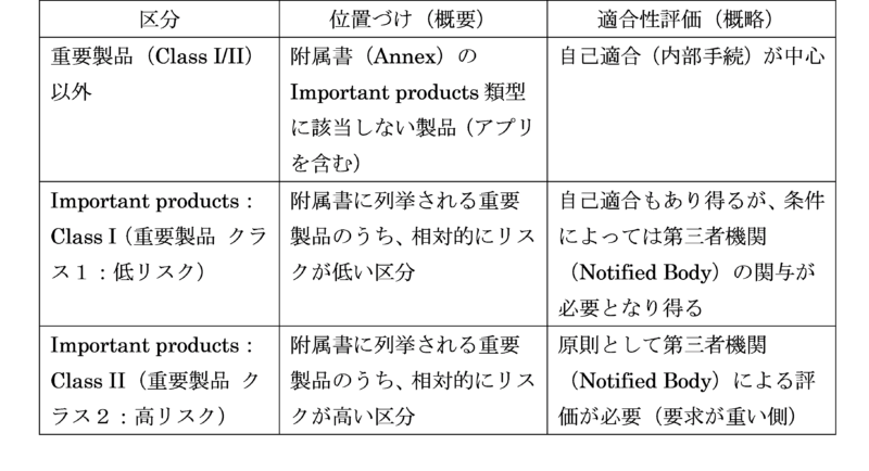 一方で、附属書に並ぶ「重要製品」の類型に当たらないソフトウェア(スマホアプリを含む)は、CRA上はひとまず “重要製品(Class I/II)ではない製品”として扱われることになります。つまり、スマホアプリかどうかよりも、そのアプリがどんな役割(機能)を担っているかが、Class I/IIに該当するかを考える際の出発点になります。