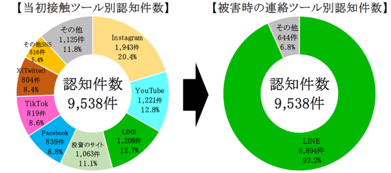 警察庁調査においては、SNS型投資・ロマンス詐欺の認知件数は2023年比でそれぞれ約4.2倍、約3.6倍となっており、被害額は2023年比でそれぞれ約4.5倍、約3.2倍となっています。比較される特殊詐欺は被害額こそ約3.1倍と同様に増加していますが、被害件数は約1.5倍となっており、SNS型投資・ロマンス詐欺が急増していることがわかります。さらにSNS型投資詐欺に至っては、特殊詐欺の被害額と同程度となっております。