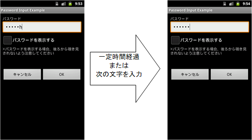 - Activity初期表示時に前回入力したパスワードがある場合、前回入力パスワードの桁数を推測されないよう固定桁数の●文字でダミー表示する