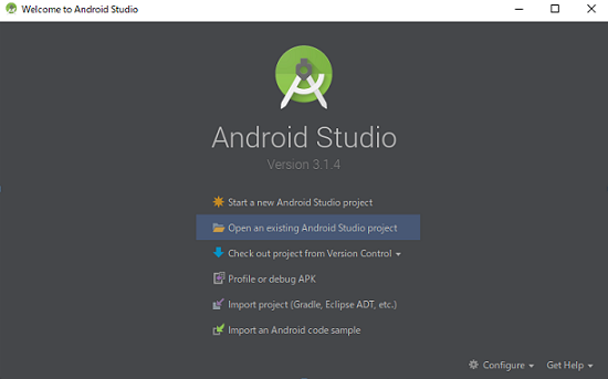 Click “Open an existing Android Studio project” from the dialog that is displayed.